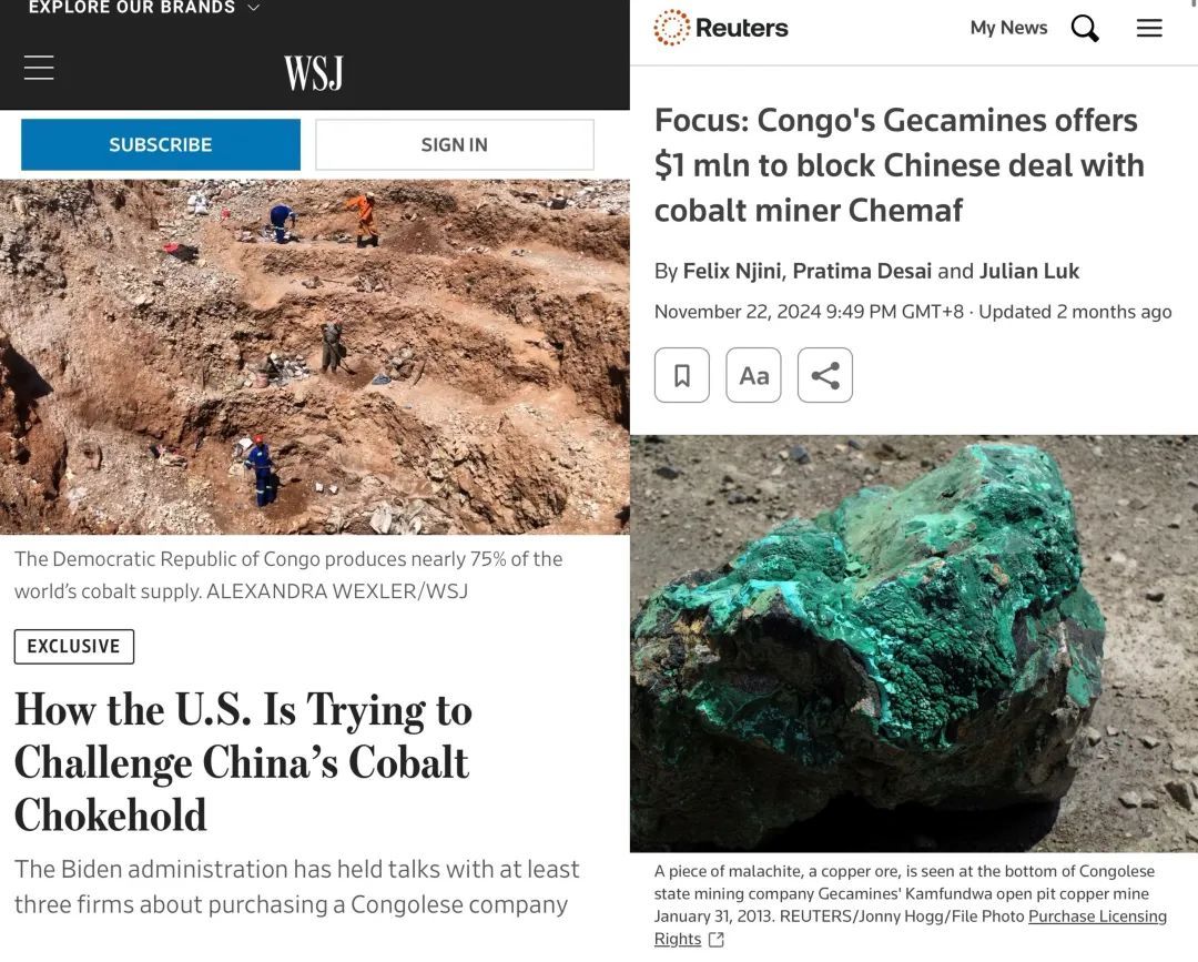 此外,美国还插手刚果(金)等国的矿产项目,企图削弱中国对钴、镍等资源的控制权。《华尔街日报》2024年10月15日发布独家报道,称美国试图挑战中国在钴领域的“卡脖子”地位。为削弱中国对钴的“全球控制力”,拜登政府正积极鼓励西方企业收购刚果(金)的钴矿项目,同时阻挠中国企业对该国钴矿公司的收购。