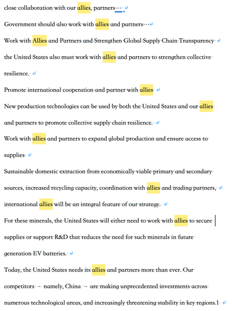 在报告中,美国承认制造业整体产能不足,在一些领域国际协调能力有限,无法独自解决自身供应链的脆弱性问题,并反复强调,要“加强与盟友、贸易伙伴间的合作”,“国际盟友将是战略中不可或缺的一部分”。